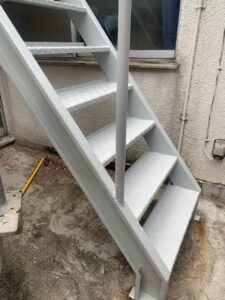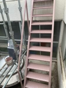 鉄骨階段は錆をしっかり落としてから防錆処理を行うことで、今後の腐食進行を抑制しています。